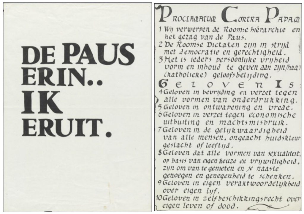 After many attempts to find contacts from this secular uprising, ultimately, Hans Dircks reached out and shared information about the secular events organized in Nijmegen during the pope’s visit in the country. The poster Proclamatum Contra Papam is likely created during one of these events.