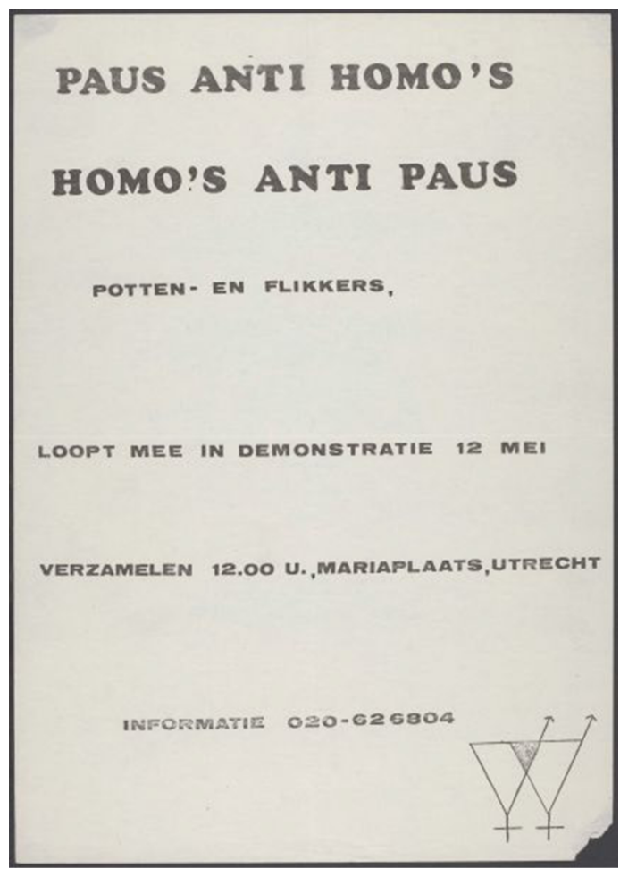 On May 11, 1985, Pope John Paul II kissed the ground of Welschap Airport near Eindhoven. It was the start of a “disastrous pope’s visit” (H). Demonstrations, protests, empty streets, and newspapers full of criticism. In IHLIA’s archives, there are six posters and a button related to this pope’s visit that make one thing very clear: gays and lesbians were angry. But why? What kind of posters are these, and who made them?