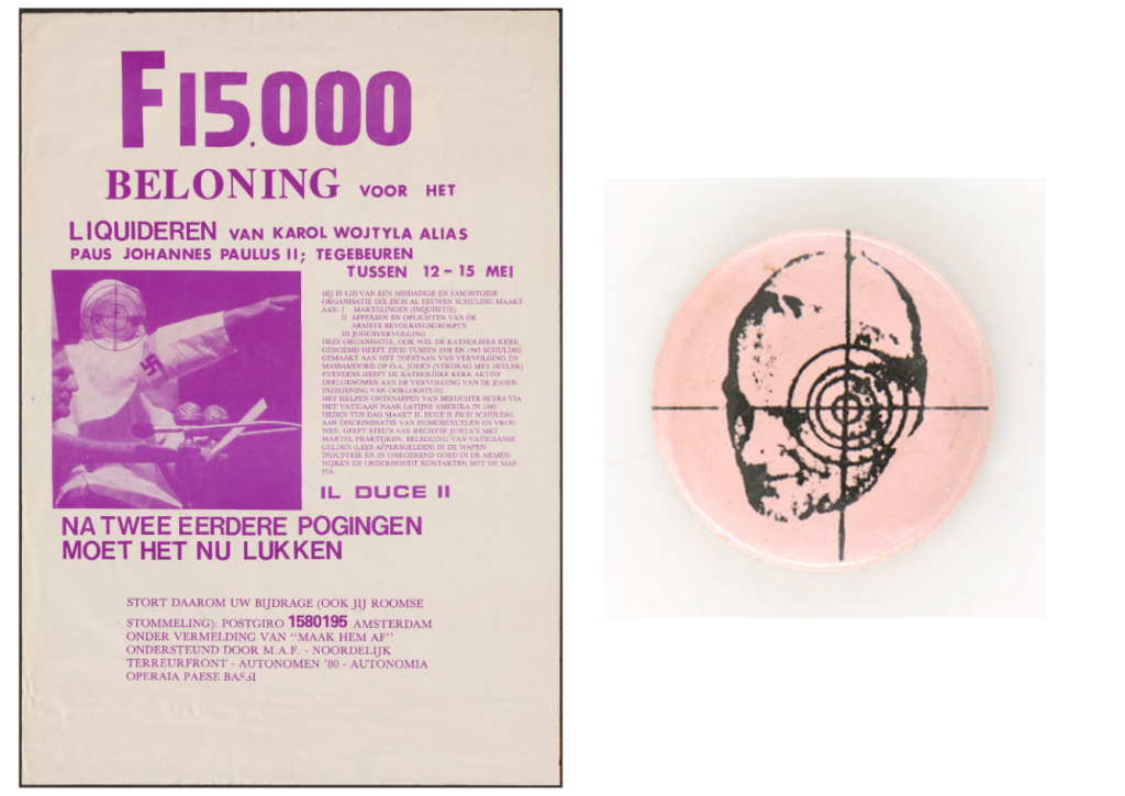Based on the idea that objects appeal more to the general public than written texts, a decision was made to center this research around objects. In the archive, my attention was drawn to objects related to the pope’s visit to the Netherlands in 1985: A button with the pope’s face depicted in a shooting target, a poster calling for the liquidation of the pope during the visit, calls to attend the protest against the pope on 12 May in Utrecht, a call for a benefit evening in support of this protest, a slogan urging people to deregister from the Catholic Church, and a poster listing statements against the pope and the Roman hierarchy. Some of these posters are clearly queer, while this is not immediately apparent with others.